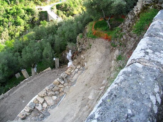 Y es que, en este momento, está en plena ejecución mejoras para la recuperación del “muro del olivar”, con el fin de reforzar la sujeción y conservación del entorno. No hay que olvidar que el Santuario de As Ermidas, declarado Bien de Interés Cultural en 2008, se erige en plena roca, de modo que excavado en la montaña.