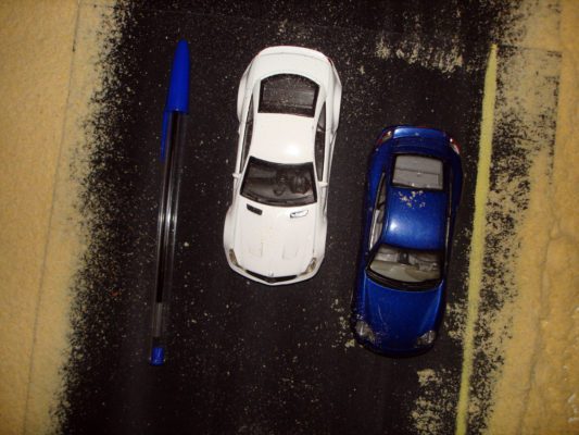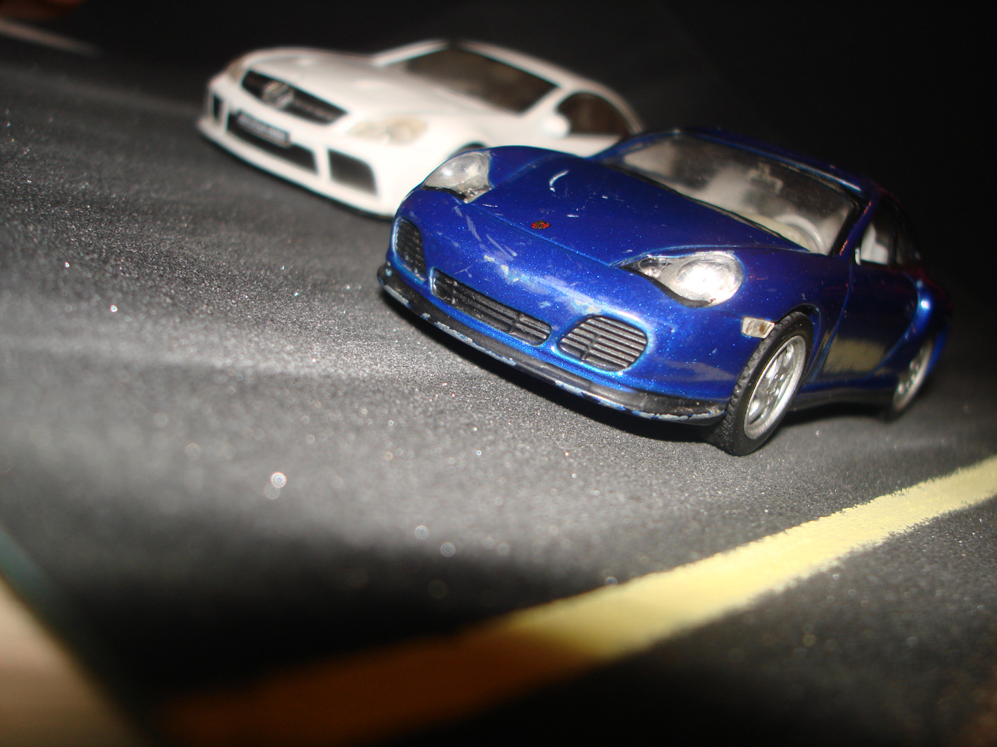 Para la iluminación usé un speedligth de mano con un softbox rectangular de 50×70, el cual lo puse en un lateral, para que la sombra que diesen los coches fuese lo mas parecida posible a la que da el sol antes de ponerse.