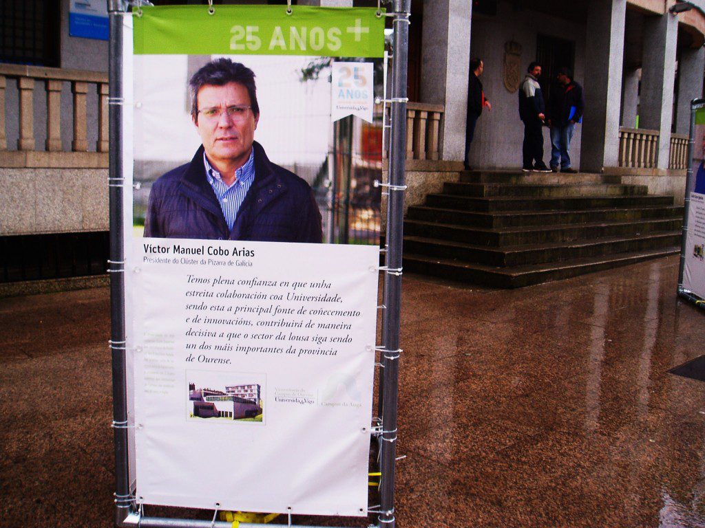 La exposición muestra diferentes sectores, actividades y profesionales de Ourense y su provincia (la actriz Miryam Gallego, presidentes de colectivos empresariales, “O Carrabouxo”, etc)los cuales brindan “o seu compromiso ca Universidade prestándonos a súa imaxe e unhas palabras sobre o que eles consideran que é o Campus de Ourense e o que esperan da Universidade para os próximos 25 anos , de aí que se chame 25 anos máis”, añadió el vicerrector .