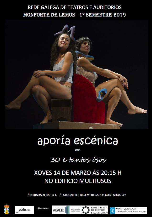 Así, la obra que se podrá ver en el Edificio Multiusos del Ayuntamiento será “30 e tantos ósos” a cargo de la compañía Aporía Escénica. La representación dará comienzo a las 20:15 horas y el precio de la entrada general será de cinco euros, mientras que para estudiantes, desempleados y jubilados será de tres euros.