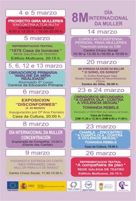 Además a lo largo del més también se podrá disfrutar del Visionado y entrega del cuento “Inés Fernández, unha muller para o 8 de marzo”, un curso de autodefensa para mujeres, la XIII Jornada de Salud en la Mujer, Talleres de Secundaria bajo el título “A Cuarta Ola: contra a violencia sexual” o de “A compañeira de piso” de la Compañía de teatro Contraproducións.