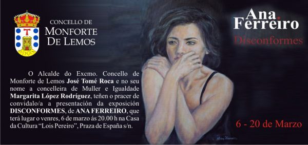 Exposición de pintura “ Disconformes”, de Ana Ferreiro: Esta exposición de pintura al óleo será inaugurada en la Casa de la Cultura Poeta Lois Pereiro el viernes 6 de marzo a las 20.00 horas y permanecerá expuesta del 6 a 20 de marzo.