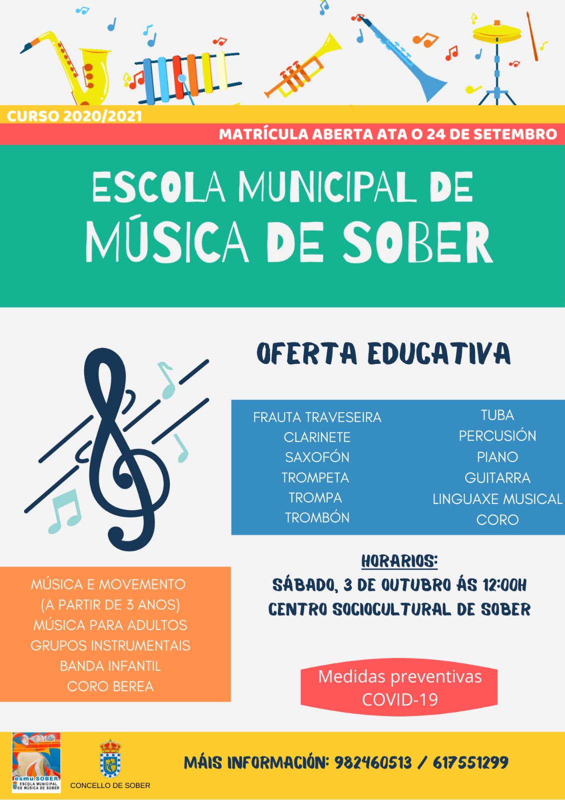 A Escola Municipal de Música de Sober abre o prazo de matrícula para o curso 2020-2021. Os interesados e interesadas poderán inscribirse ata o día 24 de setembro.