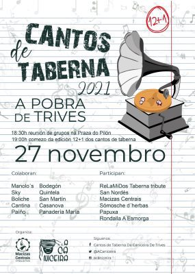 Despois do parón por mor da Covid, o sábado 27 de novembro a localidade recuperará os esperados cantos de taberna coa participación de 6 formacións tradicionais que farán un percorrido no que visitarán dez establecementos da hostalería local trivesa. Eses locais son: Manolo’s, Sky, Bodegón, Quintela, Boliche, San Martín, Cantina, Casanova, Paíño e Panadería María.