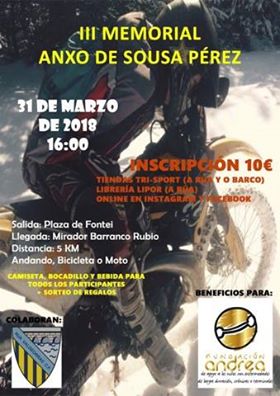 El próximo 31 de marzo, a las 16,00 horas, se desarrollará en A Rúa el III Memorial Anxo de Sousa Pérez. El precio de la inscripción es de 10 euros. Se trata de una marcha solidaria y los fondos son solidarios serán entregados, como en ediciones anteriores, a la Fundación Andrea (que brinda apoyo a niños con enfermedades de larga duración, crónicas o terminales).