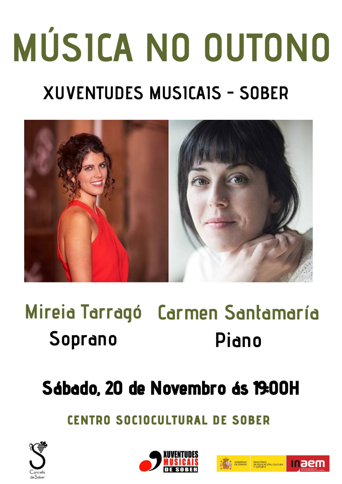 A soprano Mireia Tarragó e a pianista Carmen Santamaría presentan o sábado en Sober o seu espectáculo ‘A voz do silencio’. O concerto forma parte do ciclo ‘Música no Outono’ que organiza o Concello en colaboración coas Xuventudes Musicais de Sober. Será ás 19:00 horas no Centro Sociocultural con entrada libre.