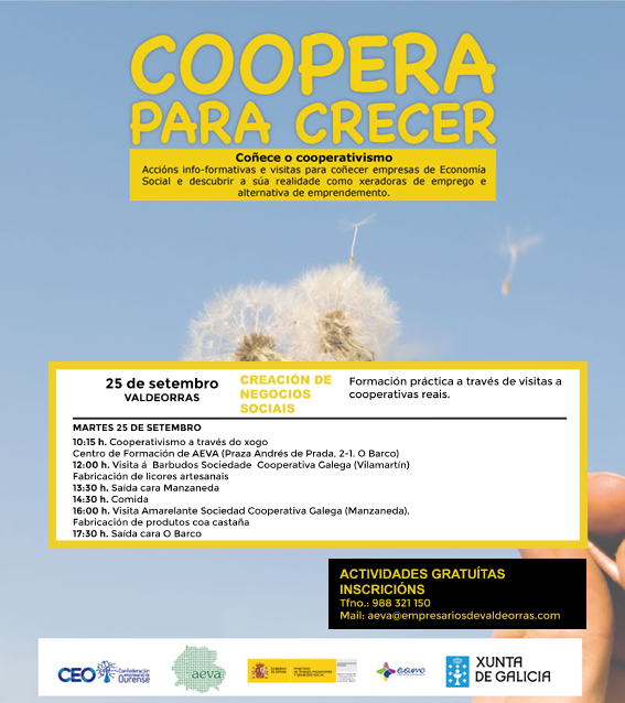 Puesta en marcha de las acciones info-formativas y visitas para conocer empresas de Economía Social y descubrir su realidad como generadoras de empleo y alternativa de emprendimiento, que conforman el plan de Actividades “Coopera para crecer” promovido por la Asociación Empresarial de Valdeorras (AEVA) y la Confederación de Empresarios de Ourense (CEO), con financiación del Ministerio de Trabajo, Migraciones y Seguridad Social, la Rede Eusumo de Cooperativismo e Economía Social, y la Xunta de Galicia y que se desarrollarán, en Valdeorras, el día 25 de septiembre.