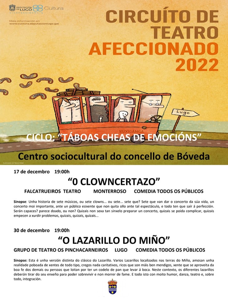 Hoxe sábado día 17 ás 18:00 horas Xosé M. Casar presenta no Centro Sociocultural de Bóveda o seu libro de poesía ‘Pretiño do Mao’ e ás 19:00 horas Falcatrueiros Teatro pon en escena a comedia para todos os públicos ‘O clowncertazo’.