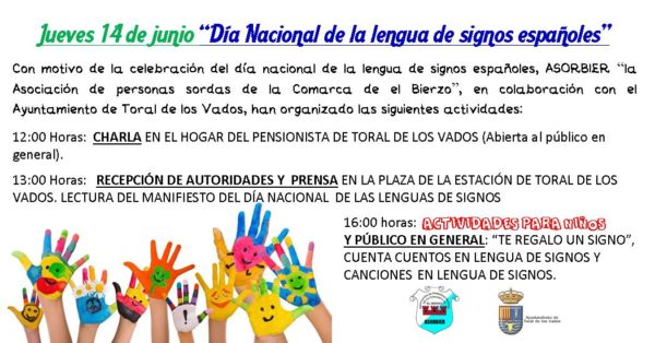 Con motivo de la celebración del Día Nacional de la Lengua de signos Españoles, ASORBIER “la Asociación de personas sordas de la Comarca de El Bierzo”, en colaboración con el Ayuntamiento de Toral de los Vados, hoy jueves 14 de junio, han organizado las siguientes actividades:
