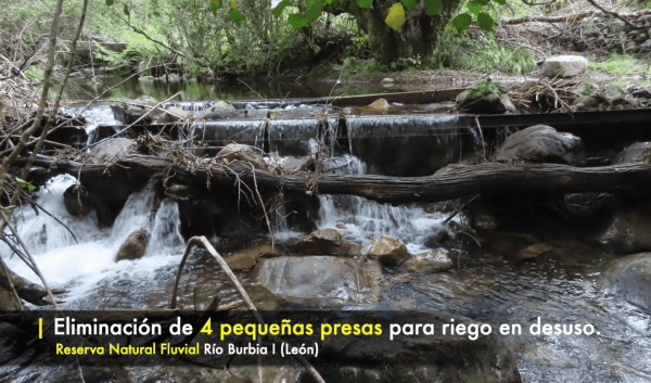 Otra actuación consistió en la retirada de 4 azudes de captaciones para riego abandonadas, así como el acondicionamiento de una pequeña área recreativa, en la Reserva Natural Fluvial del Río Burbia I (Vega de Espinareda – León).