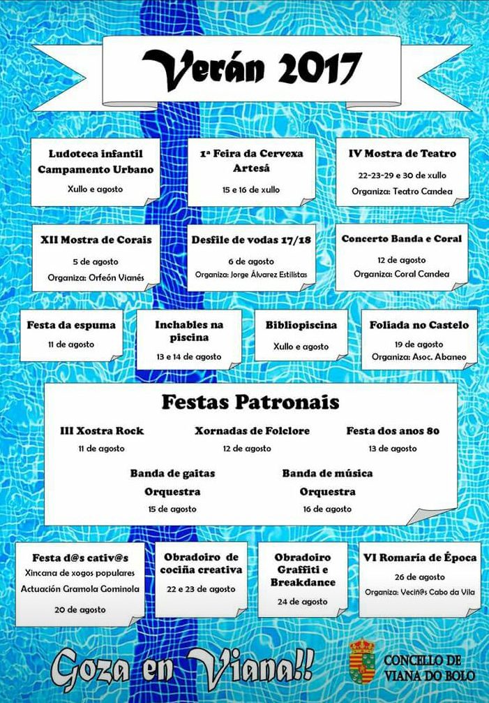 El Ayuntamiento de Viana do Bolo, que preside Secundino Fernández (BNG), ha programado el mes de agosto con un buen número de actividades que, además de dinamizar el municipio en una de las épocas que cuenta con mayor población, despliegan toda una oferta para el tiempo de ocio.