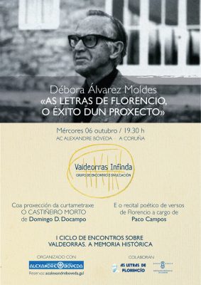Este mércores, 6 de outubro, ás 19.30 horas, Débora Álvarez Moldes ofrecerá a palestra titulada «As letras de Florencio. O éxito dun proxecto», no local da Agrupación Cultural Alexandre Bóveda da Coruña.