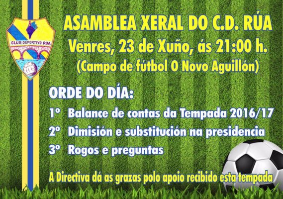 A las 21:00 horas en el campo de fútbol de O Novo Aguillón se celebrará la Asamblea General del C.D Rúa.