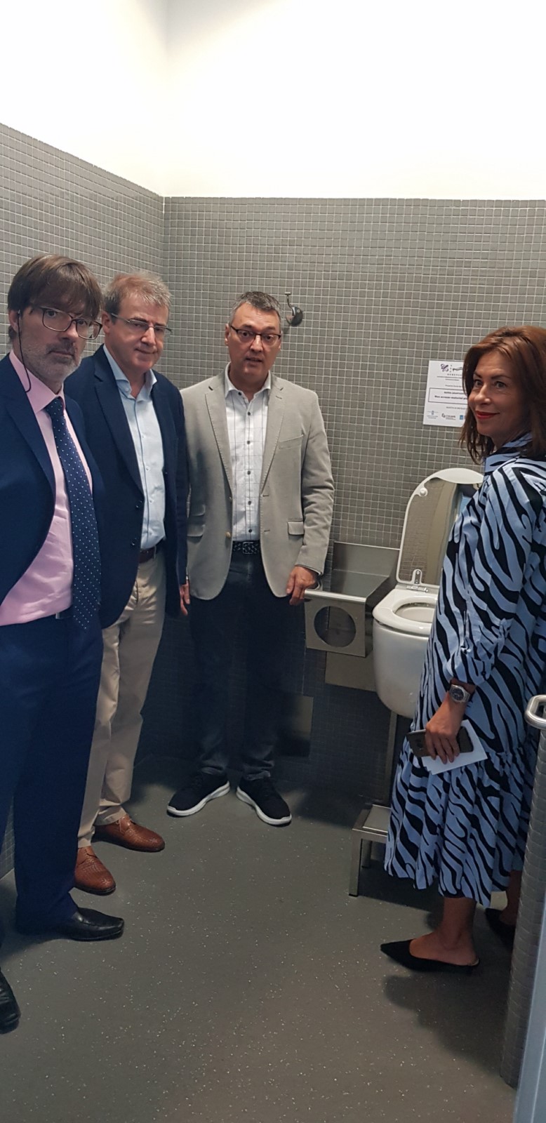 La Xunta de Galicia inicia el proyecto de implementación de baños adaptados para personas ostomizadas en distintas dependencias autonómicas, con la instalación de un baño de estas características en el nuevo Edificio Judicial, dentro del plan de la Vicepresidencia de obras menores en los edificios judiciales. La delegada territorial en Ourense, Marisol Díaz Mouteira, acompañada del presidente de la Asociación provincial de enfermos de Crohn y colitis ulcerosa (ACCU), Fernando Jiménez, supervisaron esta actuación en una visita que contó también con la asistencia del juez decano, Leonardo Álvarez.