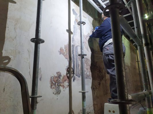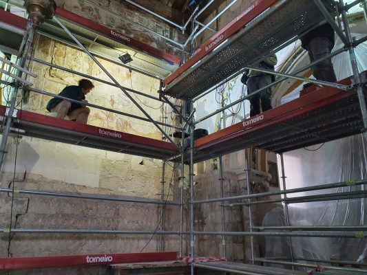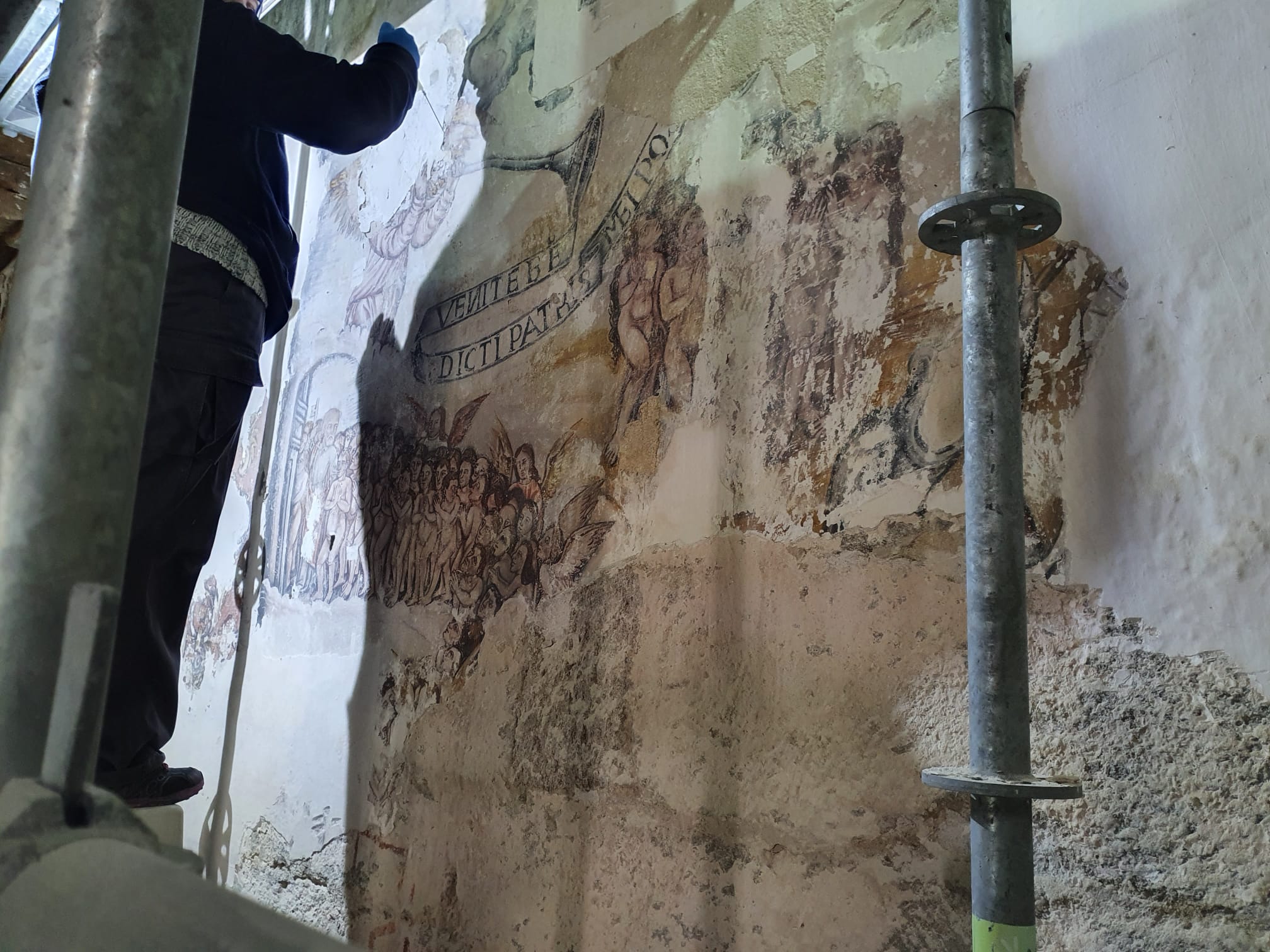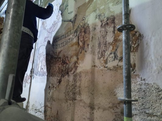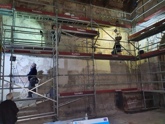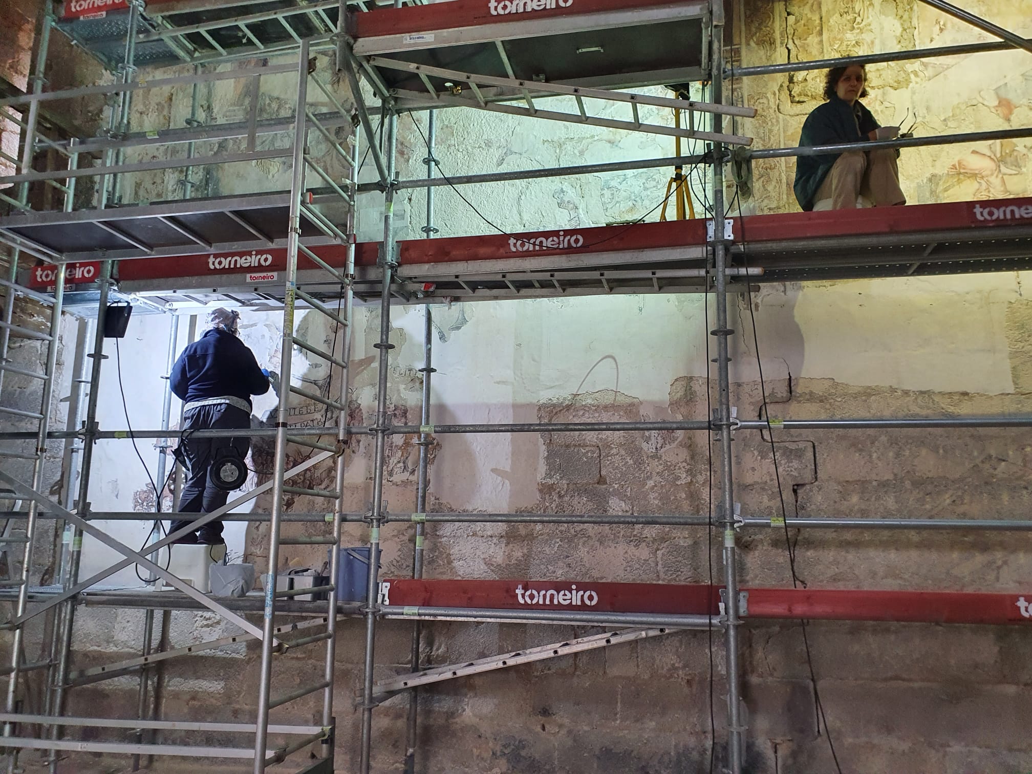 Os traballos no interior do templo van permitir recuperar as pinturas que se conservan no muro norte e no arco triunfal e algún fragmento do muro sur.