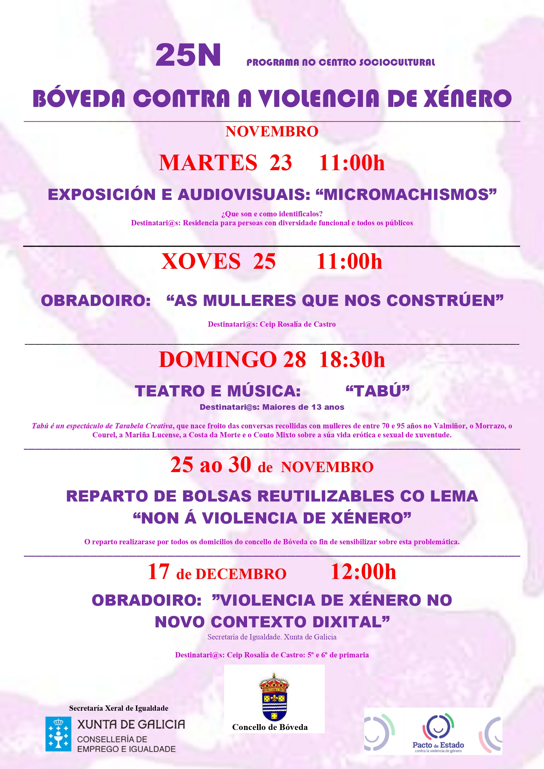 O Concello de Bóveda programa diversas actividades dirixidas a diferentes colectivos para amosar o seu rexeitamento á violencia machista con motivo do 25N. A programación desenvolverase no Centro Sociocultural.