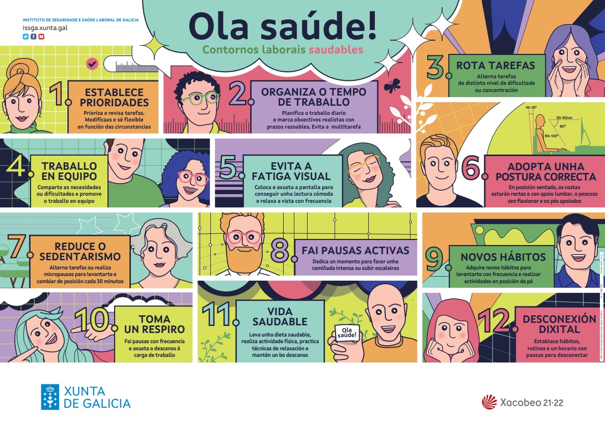 La Xunta está promocionando la creación de entornos laborales saludables que permitan proteger, promover y apoyar la seguridad y salud en el trabajo y el bienestar de las personas trabajadoras por medio de la nueva campaña ‘Ola saúde!‘ del Instituto de Seguridad y Salud Laboral de Galicia (Issga).