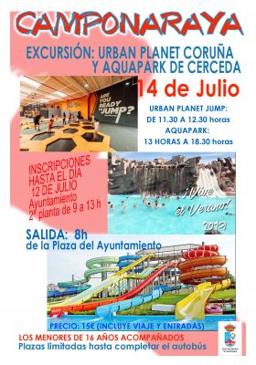Llega uno de los acontecimientos más esperados del Programa Cultural ‘Vive el Verano’ que ha organizado el Ayuntamiento de Camponaraya, la excursión al Aquapark de Cerceda, que además tendrá como ‘aperitivo’ la visita al Urban Planet del Centro Comercial Parque Oleiros.