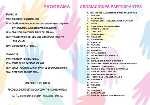 La XV Feria de Asociacionismo de El Bierzo arrancará el sábado a las 17:00 horas con la apertura del recinto ferial. A las 17:30 horas habrá una charla sobre perros mal considerados como peligrosos. A las 18:30 horas se podrá degustar comida típica de España, siendo esta actividad una de las novedades. Posteriormente, a las 19:30 horas, la Asociación de Déficit de Atención con o sin Hiperactividad (ADAHBI) realizará una presentación del método DIDE y Disciplina Positiva. A las 21:00 se cerrará el recinto ferial.