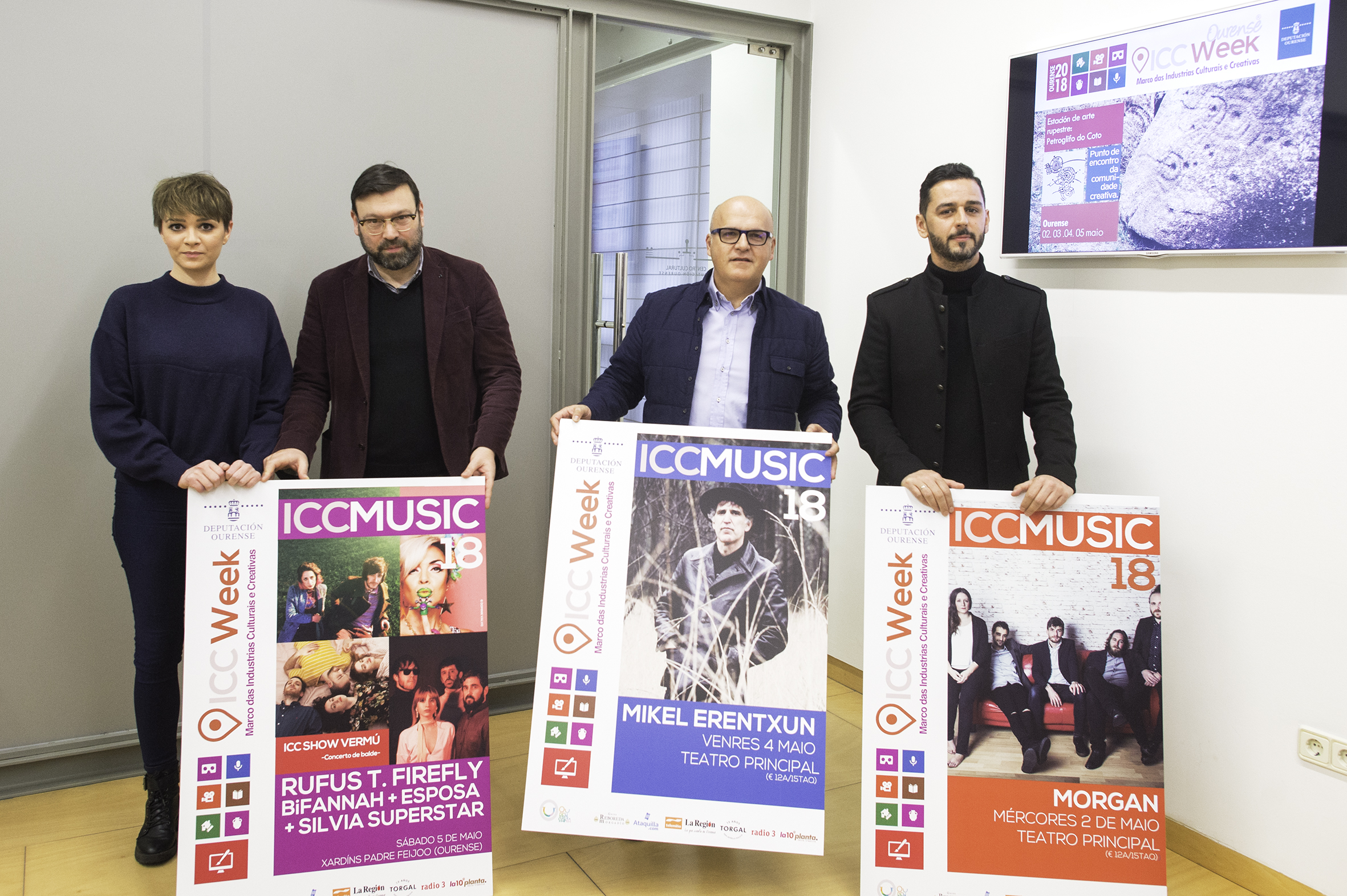 El presidente de la Diputación de Ourense, Manuel Baltar, junto a los coordinadores de la “Ourense ICC Week”, Juan Rivas y Manuel Araujo, presentaron hoy en el Centro Cultural “Marcos Valcárcel” a “ ICC Music” 2018, que tendrá como protagonistas a Mikel Erentxun y a la banda musical Morgan, completándose el programa con la sesión “ ICC Show Vermú” en la que actuarán Rufus T. Firefly, Esposa, Bifannah y Silvia Superstar DJ, llenando así el apartado musical de esta IV edición de la Semana de las Industrias Culturales y Creativas que tendrá lugar del 2 a 5 de mayo, organizada por la Diputación de Ourense.