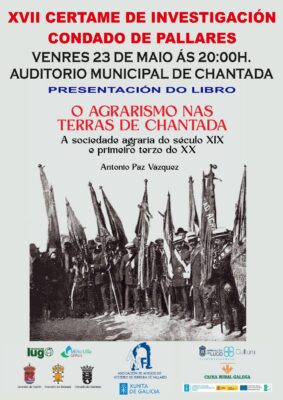 Este viernes 23 de mayo, a las 20:00 h., el Auditorio Municipal de Chantada acoge la presentación de “O agrarismo nas terras de Chantada”, el trabajo ganador del XVII Certamen Condado de Pallares. Antonio Paz Vázquez, investigador local, desgrana cómo surgieron las primeras sociedades agrarias en el siglo XIX y comienzos del XX, pieza clave para entender la evolución de nuestro territorio.