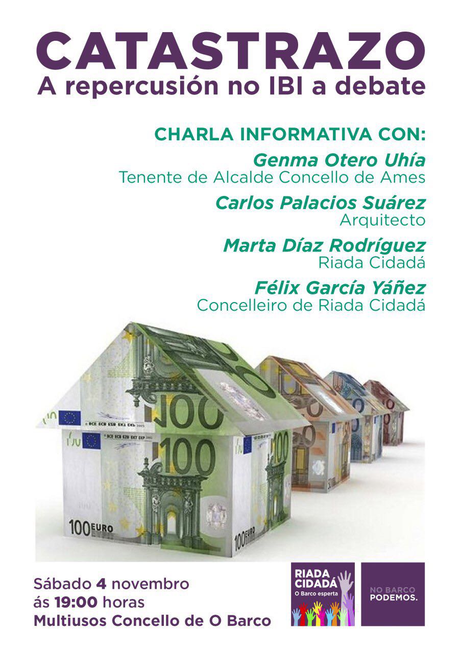 El próximo sábado, 4 de noviembre, a partir de las 19,00 horas de la tarde, el salón multiusos del Concello de O Barco de Valdeorras acogerá una charla informativa sobre el “Catastrazo”, durante la que se analizará a fondo la repercusión del Impuesto de Bienes Inmuebles (IBI).