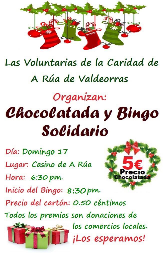 Se acerca la Navidad y es la época por excelencia de la solidaridad. Las Voluntarias de la Caridad de A Rúa de Valdeorras han organizado una chocolatada y un bingo solidario para el próximo domingo, 17 de diciembre, a partir de las 18,30 de la tarde en el Casino de A Rúa. El precio es de 5 euros por persona, cantidad que será destinada a cubrir necesidades de las personas más desfavorecidas, una labor que la citada asociación de voluntarias realiza todo el año.
