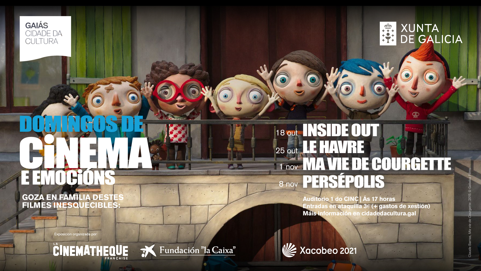 La Xunta de Galicia convertirá la Cidade da Cultura en un efímero cine de otoño para proyectar las tardes de los domingos 18 y 25 de octubre y 1 y 8 de noviembre un pequeño ciclo familiar con los filmes Inside out, Lee Havre, Me la vie de courgette y Persépolis, hitas que forman parte del amplio recorrido cinematográfico de la exposición Cine y emociones. Un viaje a la infancia del Museo Centro Gaiás.