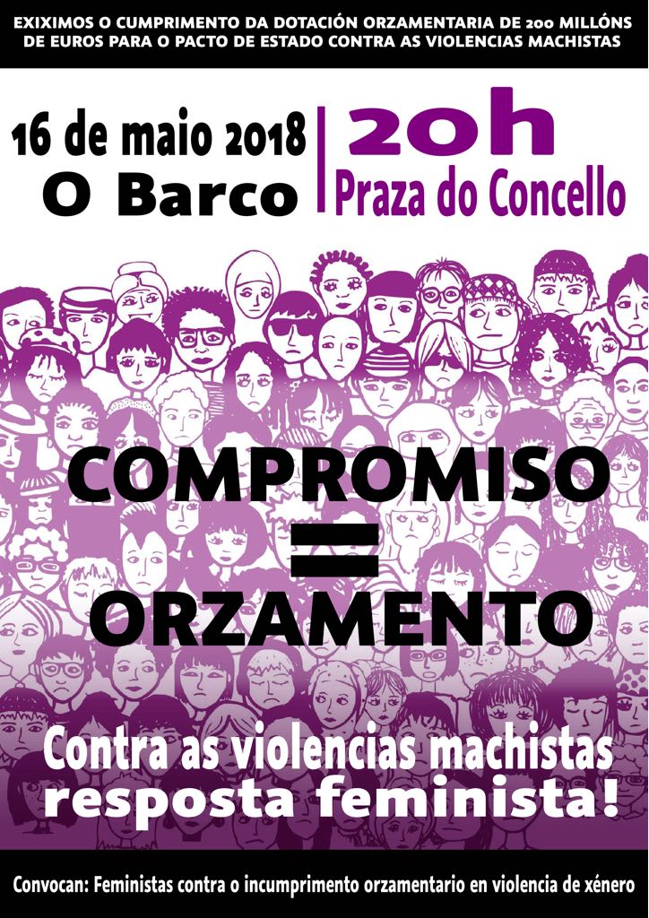 Hoy martes, a las 20,00 horas, la Plataforma Feminista de Valdeorras invita a una concentración que se desarrollará en la Praza do Concello de O Barco de Valdeorras para reivindicar el cumplimiento de la dotación presupuestaria de 200 millones de euros para el pacto de Estado contra la violencia machista.