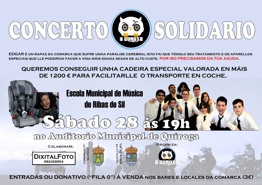 Concerto solidario en Quiroga o día 28 a prol de Edgar, o pequeno veciño da localidade que sofre unha parálise cerebral para quen se lle quere conquerir unha cadeira especial para facilitar o transporte en coche.