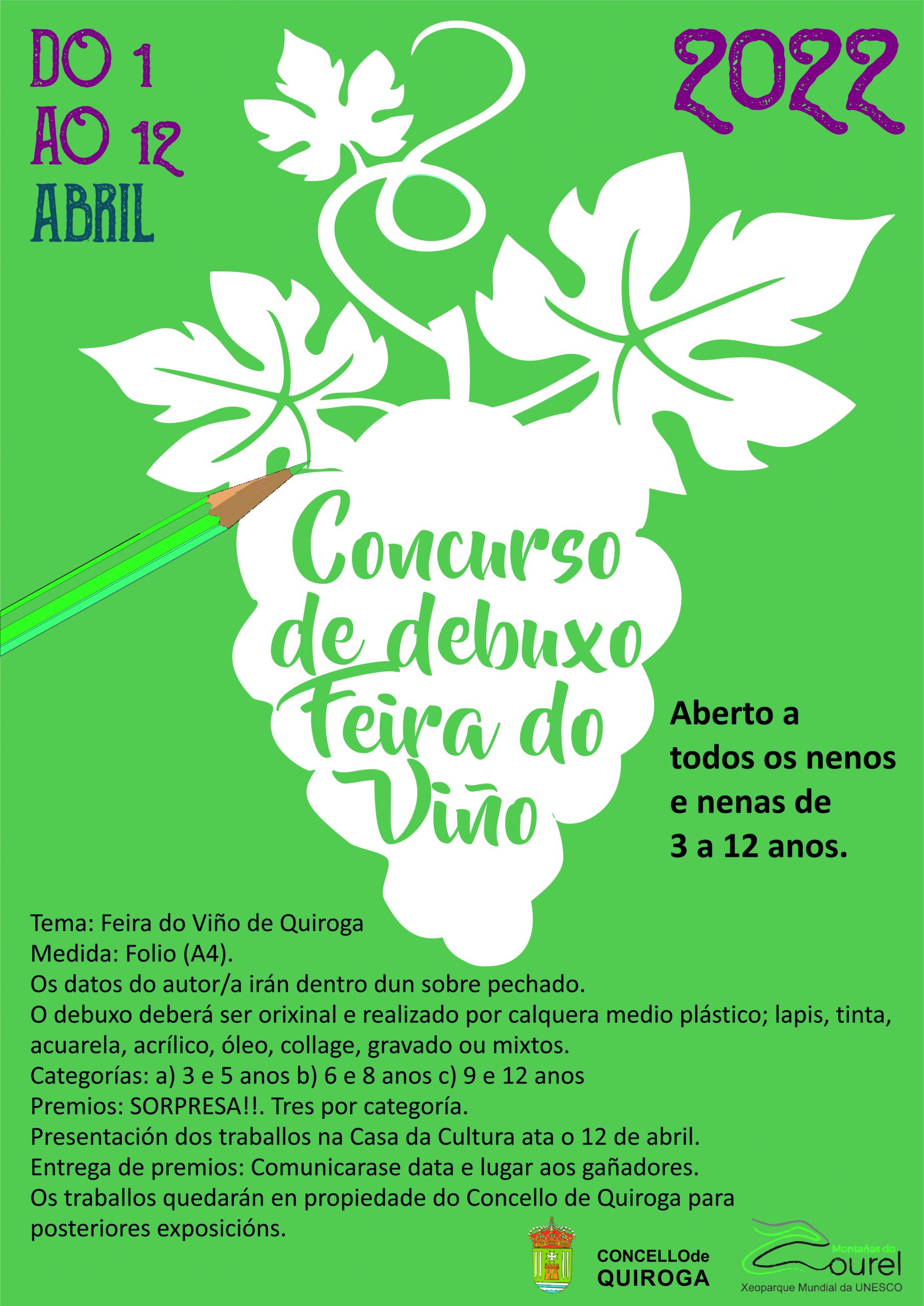Todas as nenas e nenos entre 3 e 12 anos poderán participar nun certame de debuxo que organiza o Concello de Quiroga para premiar os mellores debuxos relacionados co gran evento quirogués que exaltará os seus viños os días 16 e 17 de abril.