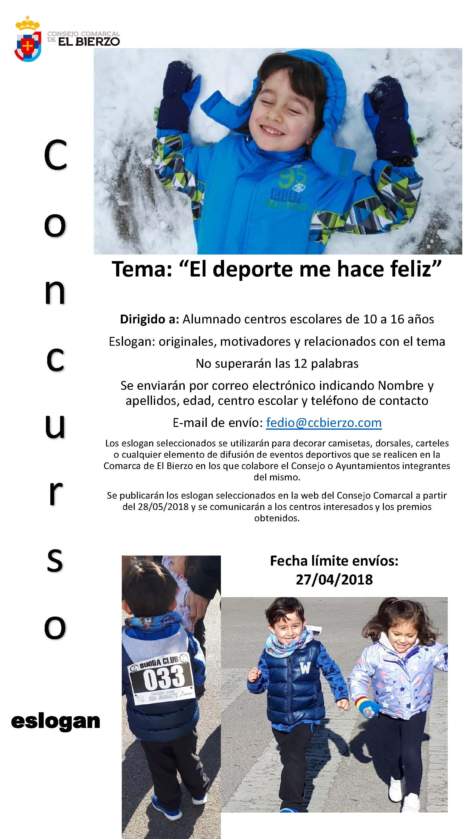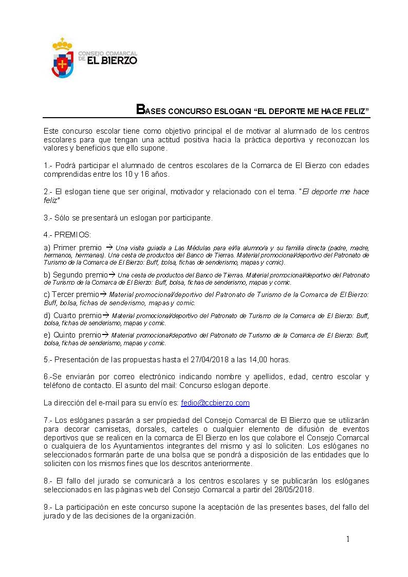 El certamen premiará al eslogan más original y motivador relacionado con el tema “El deporte me hace feliz”. Está dirigido a alumnado de centros escolares de la comarca de entre 10 y 16 años.  Cada participante podrá presentar un eslogan enviando un correo electrónico a fedio@ccbierzo.com con el asunto “Concurso eslogan deporte” antes del viernes 27 de abril. Deberá indicar su nombre, apellidos, edad, centro escolar y teléfono de contacto.