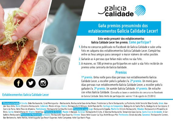 Para participar en el concurso, que se desarrollará en la red social Facebook entre hoy 27 de julio y el 11 de agosto (hasta las 23:00 horas), los usuarios deben subir una foto realizada en cualquiera de los establecimientos Galicia Calidade “Lecer” (indicando de qué establecimiento se trata) y compartirla con sus amigos para conseguir el mayor número de votos posible.