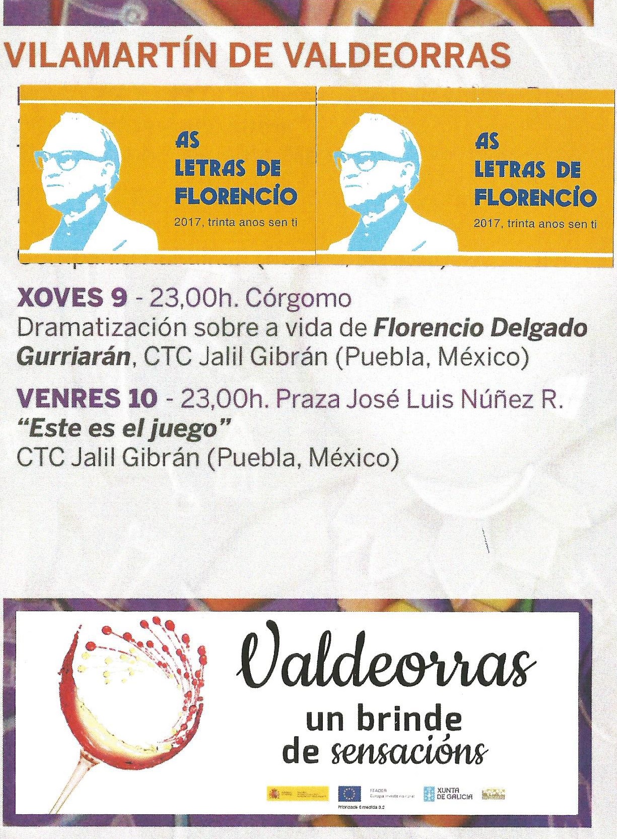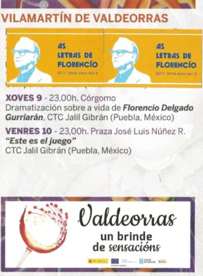 Hoy jueves, 9 de agosto, a las 23,00 horas, Córgomo (Vilamartín) acogerá una “Dramatización sobre la vida de Florencio Delgado Gurriarán” a cargo de la compañía CTC Jalil Gibrán de Puebla de México y dentro de los “Encontros de Teatro Internacional Paco González” que se están desarrollando en O Barco, A Rúa, Petín y Vilamartín.