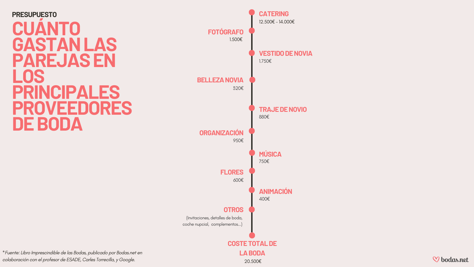 En una boda, cada pareja contrata una media de 10 proveedores, según datos del Libro Imprescindible de las Bodas. El proveedor en el que más presupuesto destinan las parejas españolas es en el catering. El precio medio del catering ronda los 12.500€-14.000€, dependiendo de si el catering es propio de la finca o lugar de celebración o no, y suele ser uno de los motivos de descarte a la hora de elegir el lugar de celebración, ya que le dan mucha importancia.