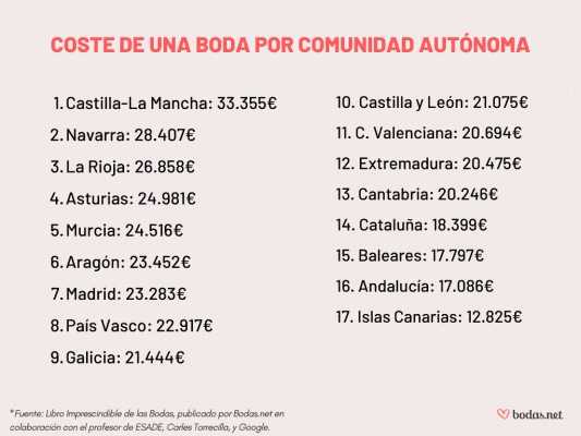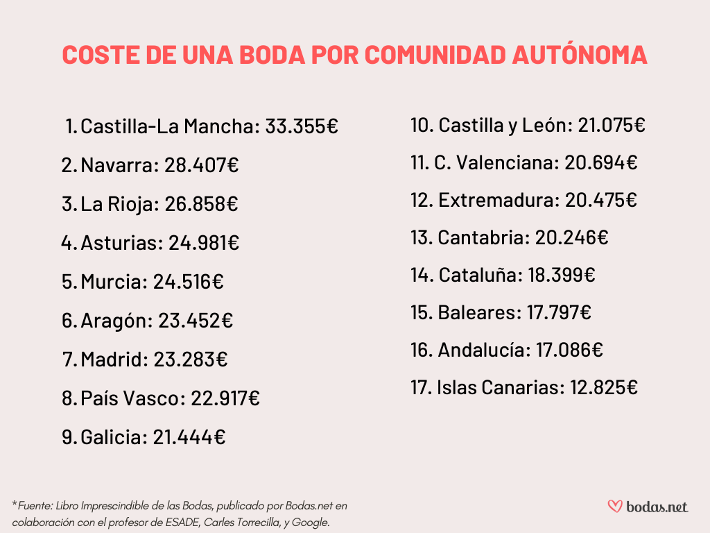 El precio medio de una boda en España se sitúa en los 20.500€ y asisten 130 invitados, según el Libro Imprescindible de las Bodas, publicado por Bodas.net en colaboración con el profesor de ESADE, Carles Torrecilla, y Google. Esta cifra varía según la zona en la que se celebre y viene muy determinada por el número medio de invitados que asiste a la boda. En este sentido Castilla La Mancha se sitúa a la cabeza con un coste medio de más de 33000€, con 179 invitados de media, y las Islas Canarias está a la cola, con un coste medio de 12800€ y con 115 invitados.