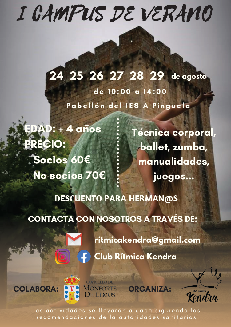 Finalmente, o Club Kendra organiza a primeira edición do Campus de Verán de Ximnasia Rítmica que se celebrará entre o 24 e o 29 de agosto no Pavillón do I.E.S. Pinguela en horario de 10:00 a 14:00 h.