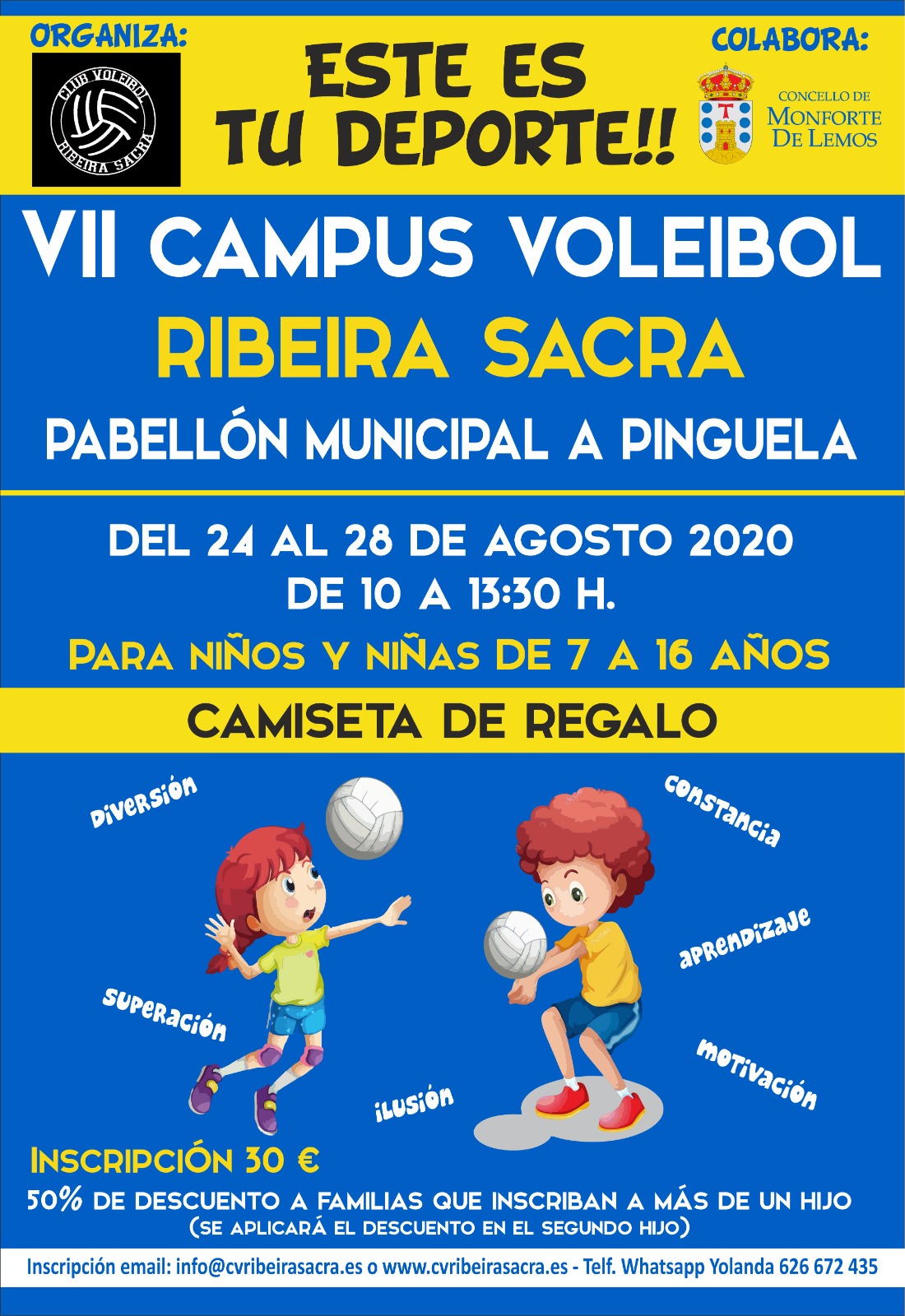 O Club de Voleibol Ribeira Sacra organiza a sétima edición do Campus de Voleibol que se celebrará entre o 24 e o 28 de agosto no Pavillón Municipal da Pinguela en horario de 10:00 a 13:30 horas.