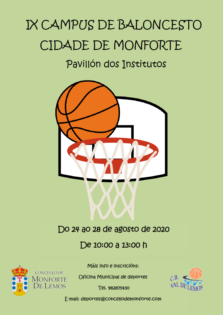 O Concello de Monforte organiza a novena edición do Campus de Baloncesto Cidade de Monforte que se celebrará entre o 24 e o 28 de agosto no Pavillóns dos Institutos Río Cabe e Daviña Rei en horario de 10:00 a 13:00 h.
