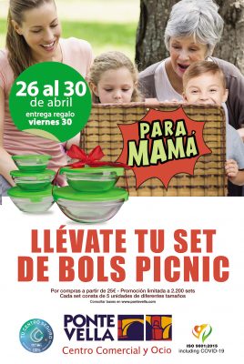 El Centro Comercial Ponte Vella inician hoy la campaña de promoción del Día de la Madre que se prolongará hasta el próximo viernes, 30 de abril. Este día, el Centro Comercial obsequiará a sus clientes con un set de cinco bols de cristal para picnic, todos ellos de diferentes tamaños.