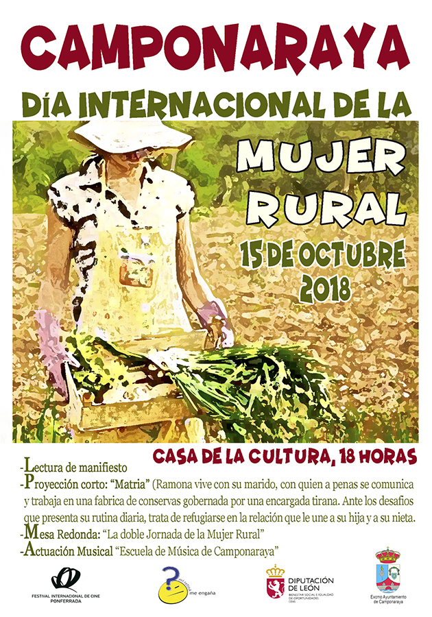 El Ayuntamiento de Camponaraya, con la colaboración de la Diputación de León y Mi Retina Me Engaña, asociación encargada de organizar y programar el Festival Internacional de Cine de Ponferrada han preparado una serie de actividades para celebrar el Día Internacional de la Mujer Rural.