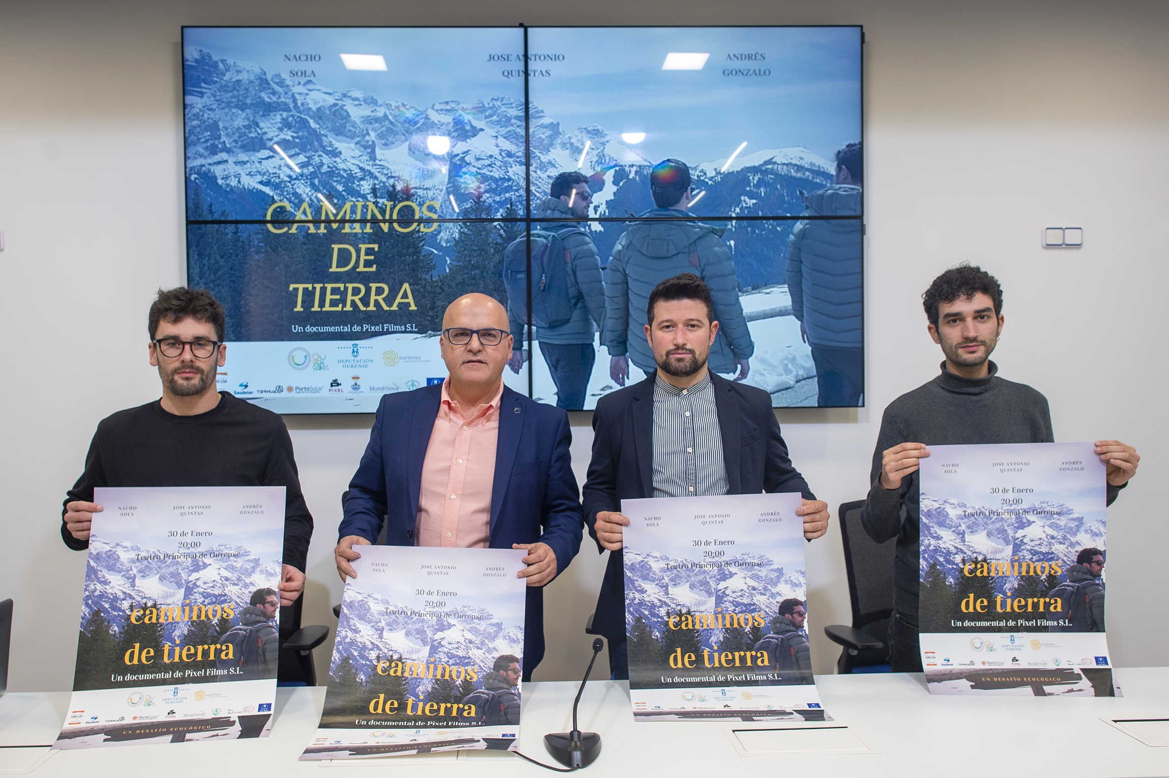 El documental “Caminos de tierra” ya tiene fecha de estreno, será el próximo jueves, 30 de enero, a las 20.00 horas, en el Teatro Principal de Ourense, cuando los espectadores podrán conocer el resultado de este proyecto en el que tres jóvenes ourensanos vivieron la aventura de promocionar Ourense en un viaje por Europa con una caravana autosostenible para demostrar el potencial de las energías renovables y el atractivo turístico de nuestra provincia. La presentación del documental tuvo lugar ayer en la sala de prensa del Pazo Provincial, acto en el que participó el presidente de la Diputación de Ourense, Manuel Baltar; el responsable de marketing digital del documental, Nacho Suela; el conductor y el técnico deportivo, Andrés Gonzalo; y el productor, José Antonio Quintas.