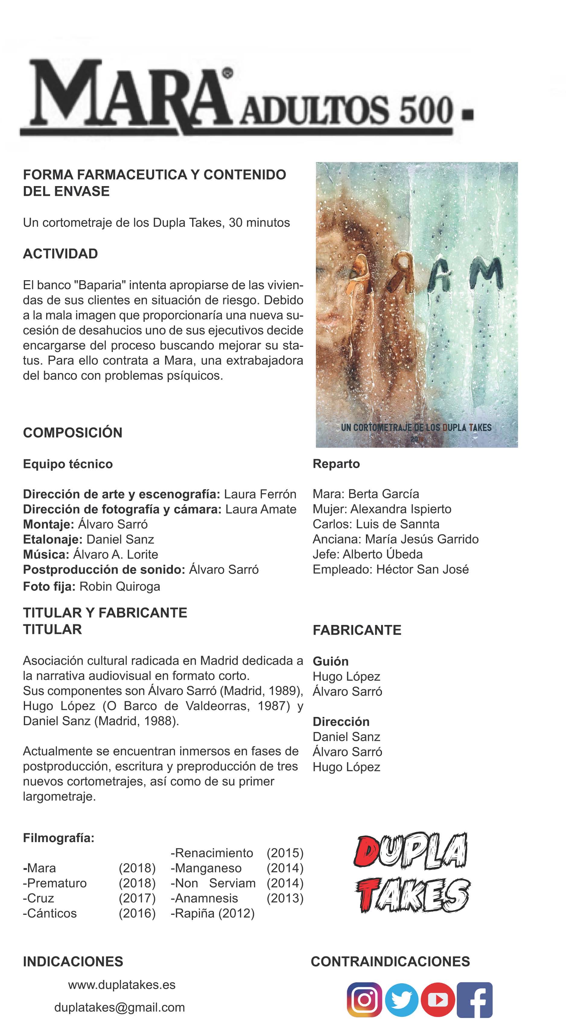 Se acaba de estrenar el último corto de Dupla Takes, MARA. Puede visionarse a través de la plataforma YouTube. Todos Sus proyectos han salido adelante sin ningún tipo de financiación y han sido concebidos para ser distribuidos de forma libre y gratuita.