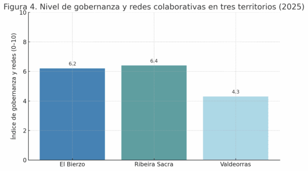 Ribeira Sacra destaca en gobernanza y retorno poblacional, con una orientación más institucional y estratégica, pero menor desarrollo operativo en logística inversa o espacios productivos colaborativos.