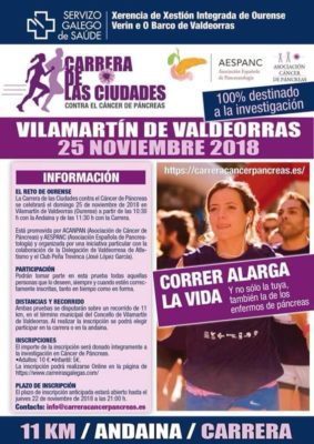 - La Carrera de las Ciudades contra el Cáncer de Páncreas se celebrará el domingo 25 de noviembre de 2018 en Vilamartín de Valdeorras (Ourense) a partir de las 10:30 h con la Andaina y de las 11:30 h con la Carrera