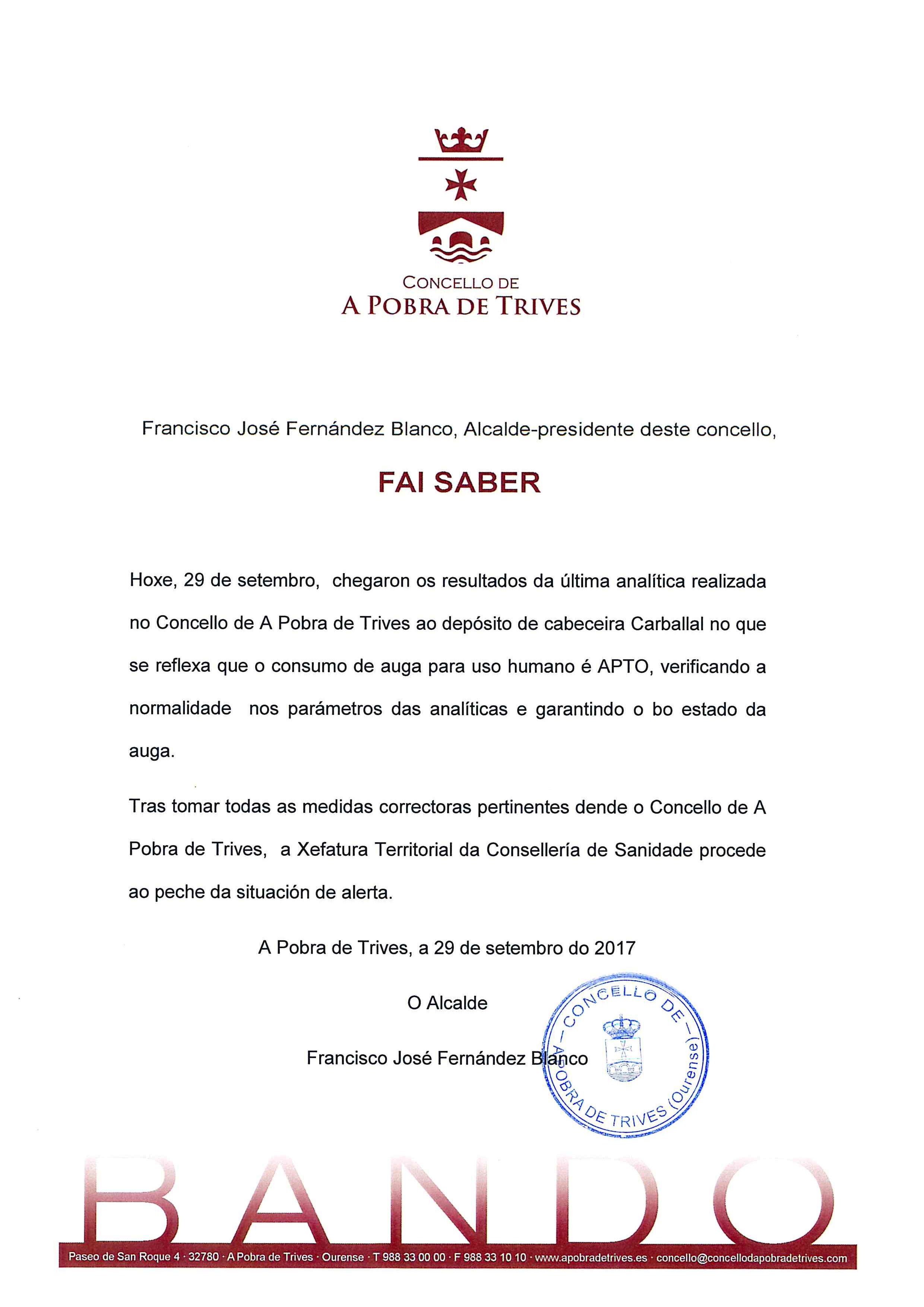 Tras tomar todas las medidas correctoras pertinentes desde el Ayuntamiento de A Pobra de Trives, la Jefatura Territorial de la Consellería de Sanidad procede al cierre de la situación de alerta.