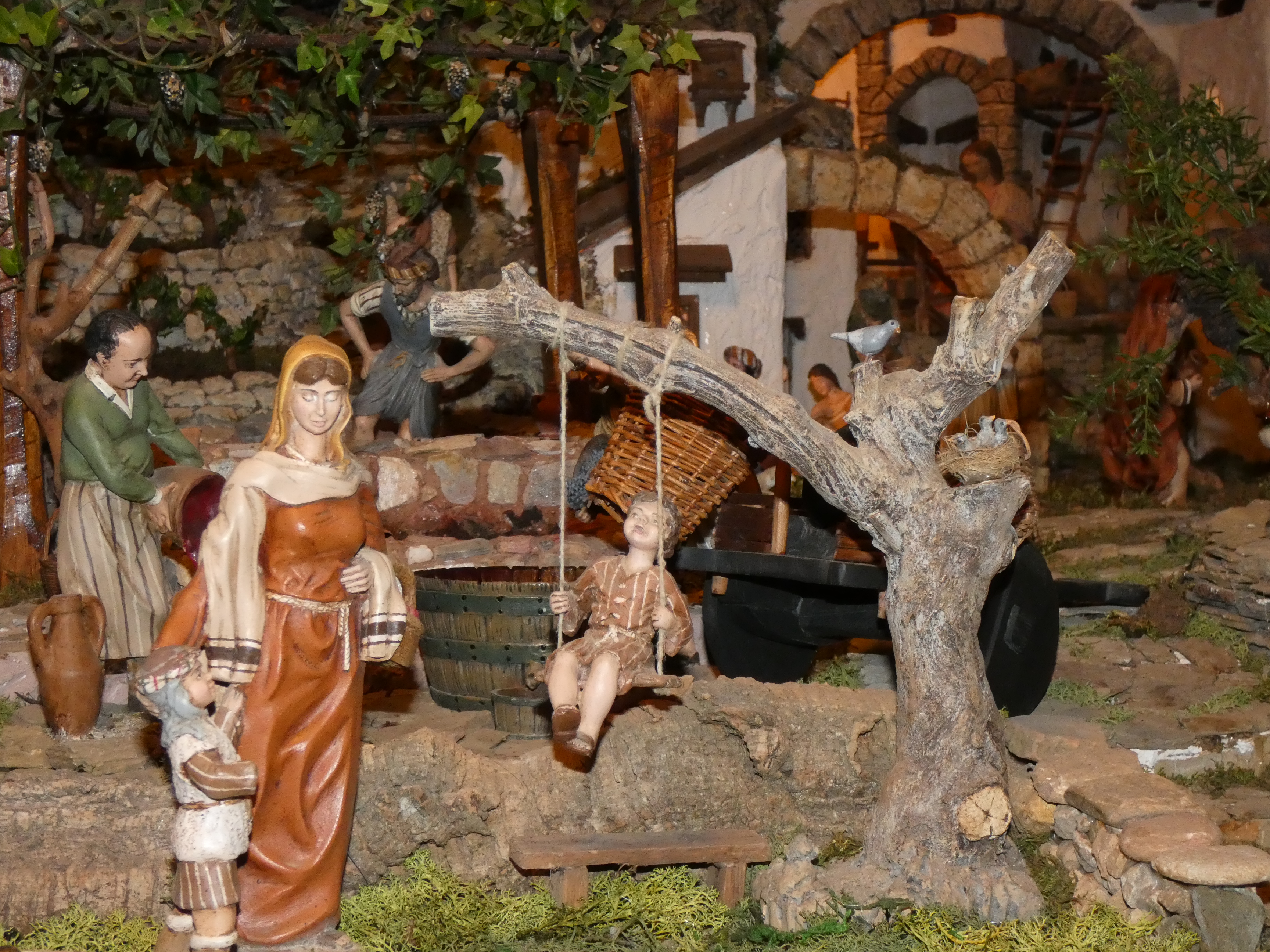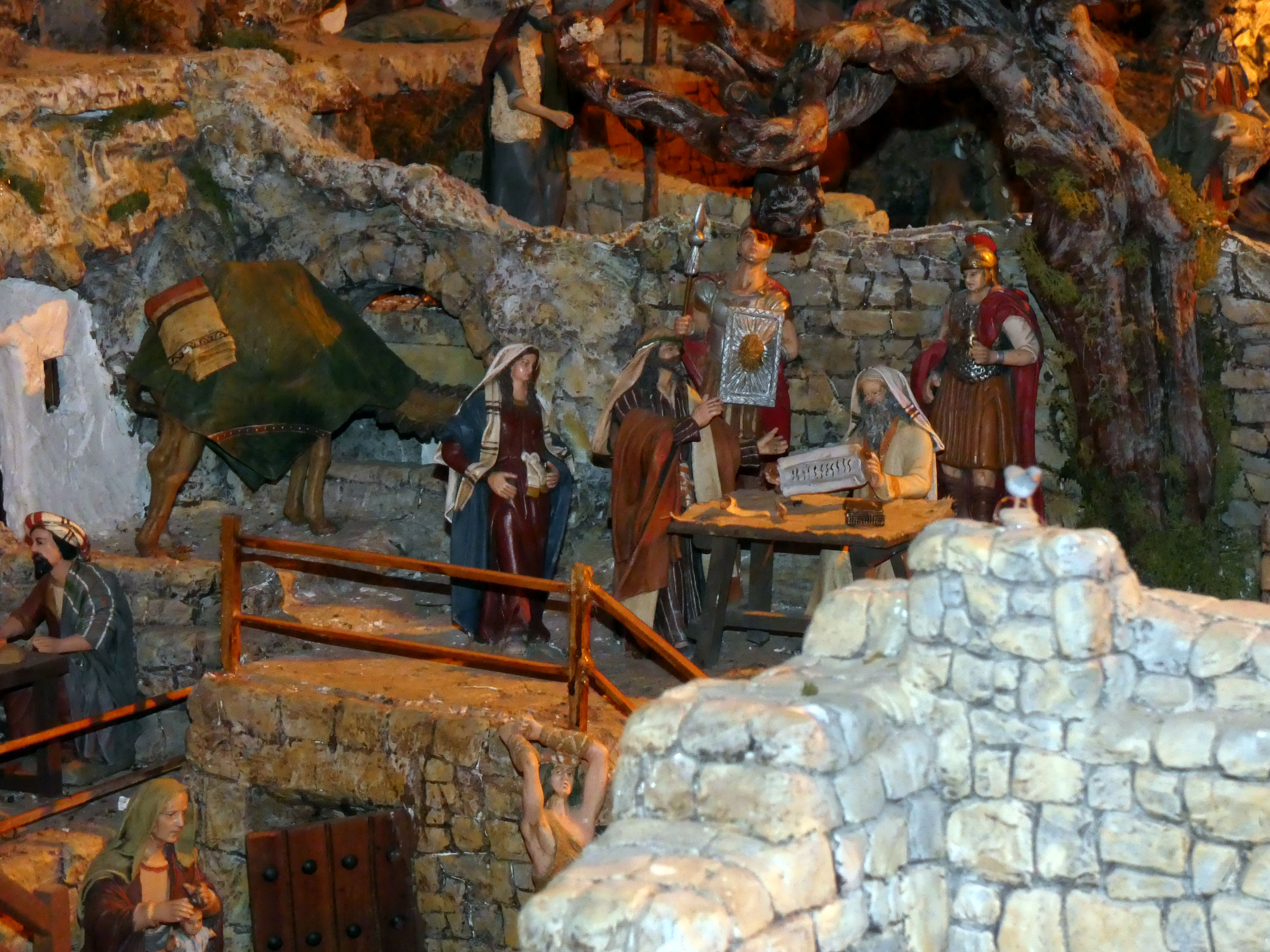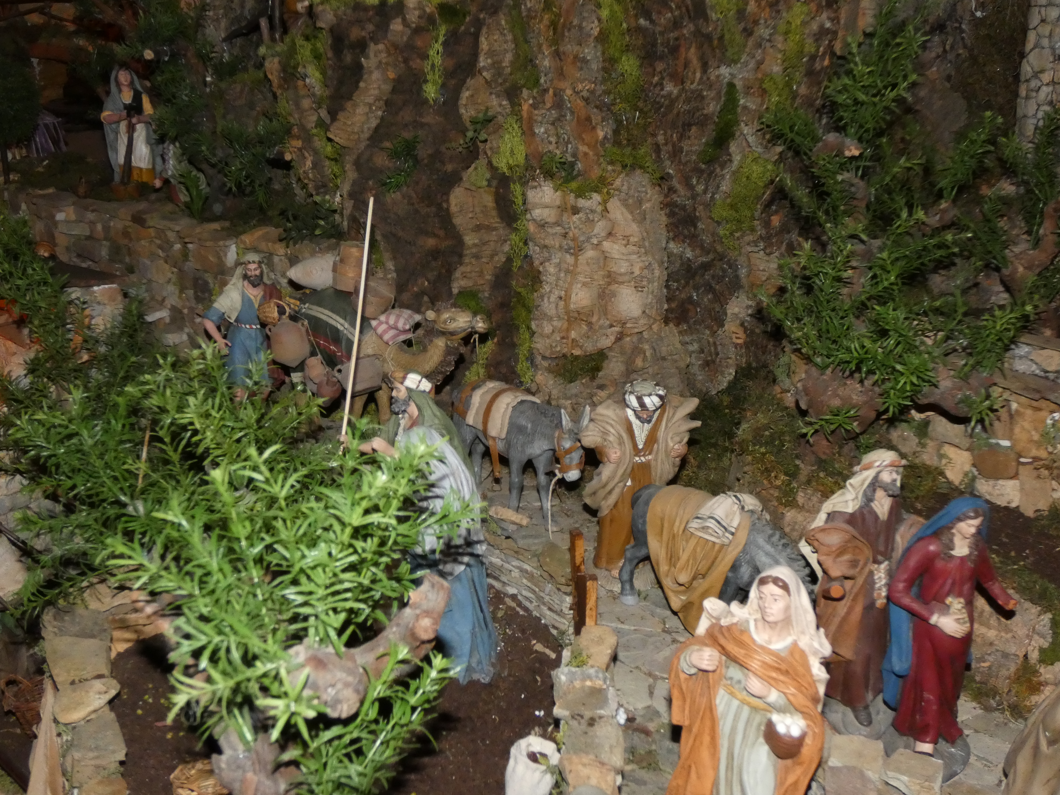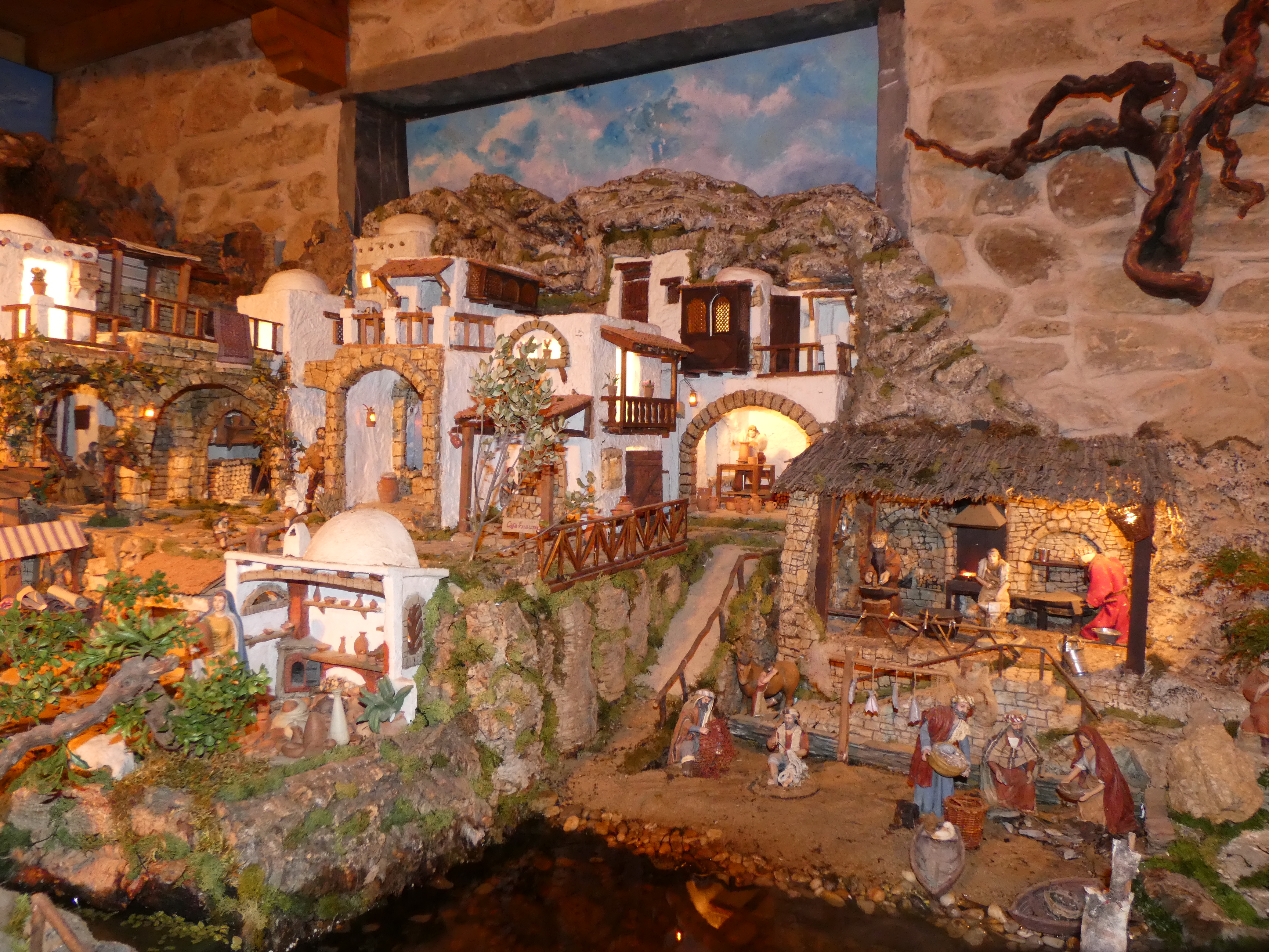 El belén tiene movimiento, fases de luz (día, noche y amanecer), edificaciones propias de la época, el río y efectos como la niebla. Además, se pueden diferenciar distintas zonas geográficas como Nazaret. También, la anunciación del ángel a la Virgen; Jerusalén; el Palacio del Rey Herodes; zona de olivos con la prensa de aceite; caravanas hacia Belén a raíz del edicto del emperador César Augusto que obligaba a empadronarse en su lugar de origen, la Virgen estaba embarazada camino de Belén para empadronarse; escena de la circuncixión, la Sinagoga; la Posada; el nacimiento en una cueva; la persecución de Herodes contra los menores de dos años; Oficios como el de los herreros y alfareros; pastores; los Reyes Magos etc.