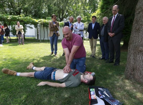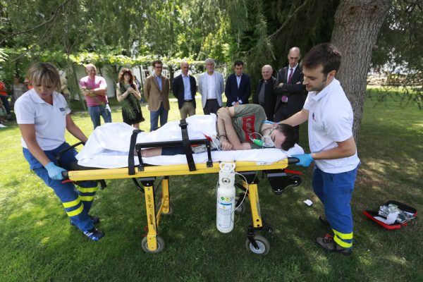 Tras la firma del acuerdo de colaboración entre las consellerías de Sanidad y Cultura y Turismo, tuvo lugar un simulacro en el que se recreó la asistencia, a una persona que sufre una parada cardiorrespiratoria, realizada por un testigo que utiliza un desfibrilador semiautomático externo, mientras una unidad de soporte vital avanzado del 061 de Galicia se está desplazando al punto.