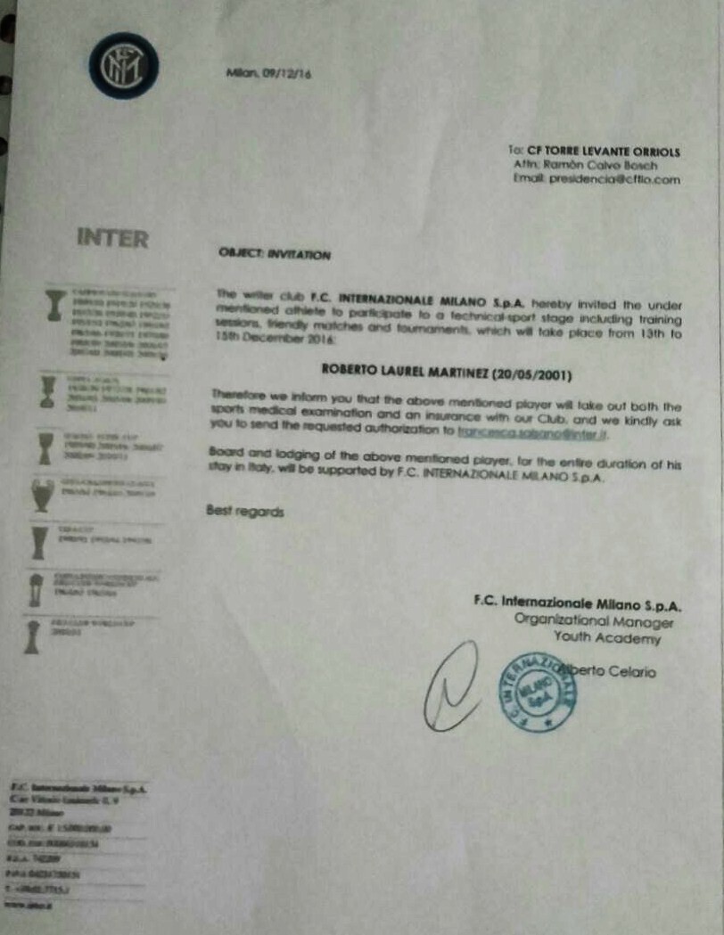 Carta oficial que recibió Roberto Laurel para las pruebas en el Inter de MilánPor Redacción CTP / 28 diciembre, 2016 Compartir en FacebookCompartir en Twitter