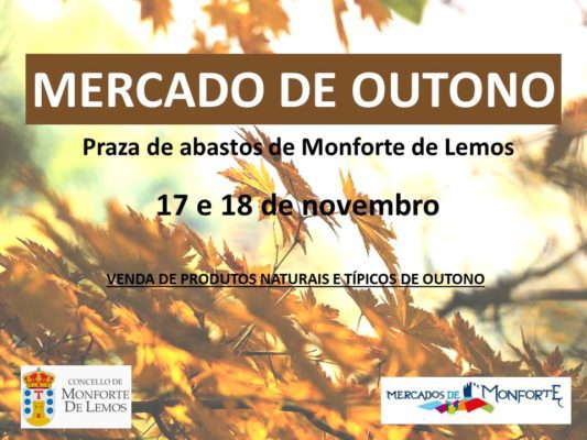 El Ayuntamiento de Monforte celebra los días 17 y 18 de noviembre un mercado de otoño en la Plaza de Abastos. En este espacio va a ser posible adquirir los productos de esta temporada, como por ejemplo: setas, castañas, nueces o membrillos. Por otra parte, habrá repostería elaborada con esos mismos productos, como licores, sidra y dulces.